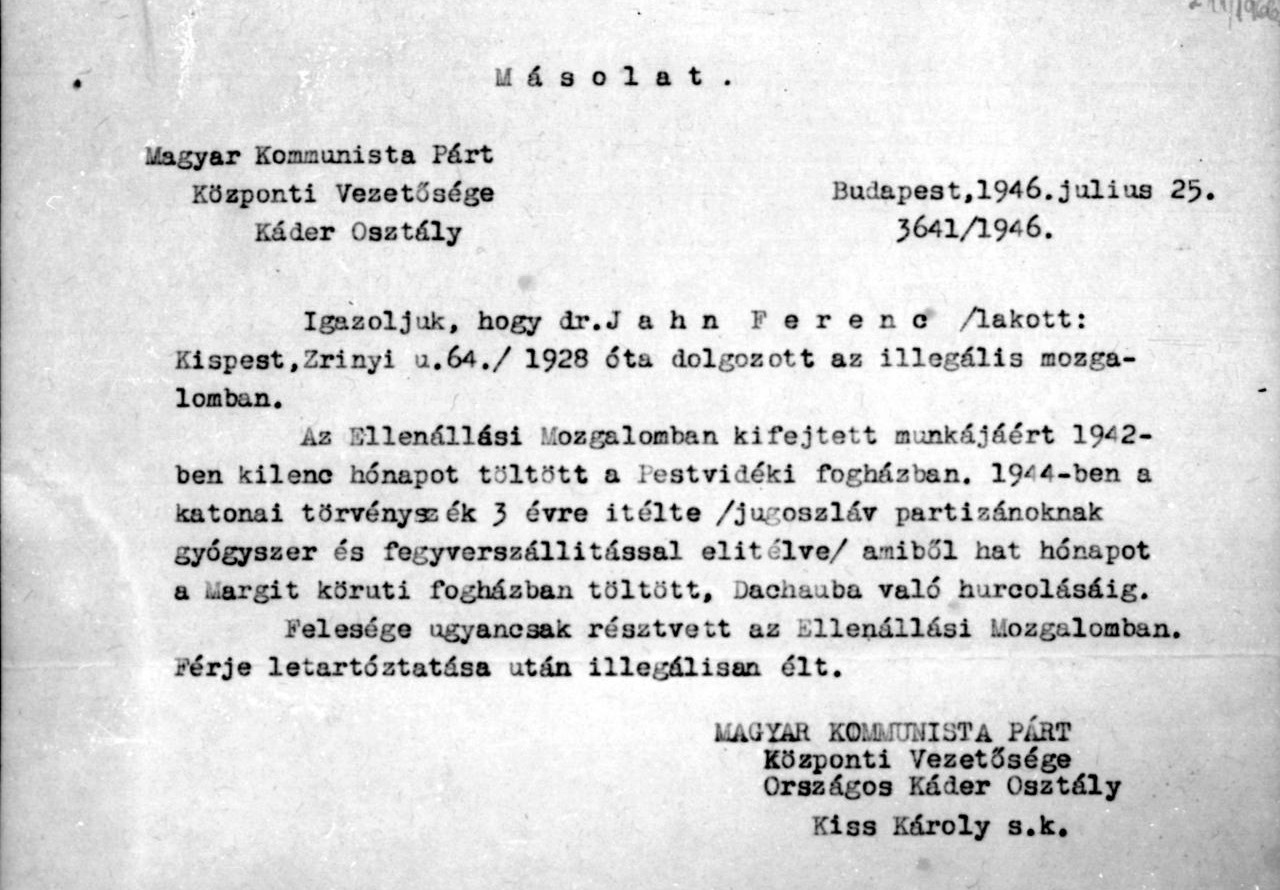 „Tudtam, hogy Jahn elvtárs VS-vonalon közvetlen irányítást kap, mert gyakran történt, hogy amikor az alsó VS-vonalak megszakadtak, Jahn elvtárs összeköttetései révén folyamatosan látta el a délpesti kerületet. Például 1935 elején lebukás folytán a budapesti PB anyagi eszközök nélkül maradt [ami a népelnyomás elleni földalatti szervezést, hivatásos forradalmárok működését, a nyomdai munkát és minden akciót megbénított – J. A.] és egy alacsony fekete, félszemű elvtárs, aki Moszkvából jött, megkért, hogy miután kispesti vagyok, vezessem el őt Jahn Ferenchez, mert ő fogja helyreállítani a megszakadt kapcsolatot. Jahn elvtárs a megbízást teljesítette, s helyreállt az összeköttetés a felső vonallal, és az elvtársak újból részesültek az ellátmányban. Legközelebbi illegális találkozónkon erről tudomást szereztem.