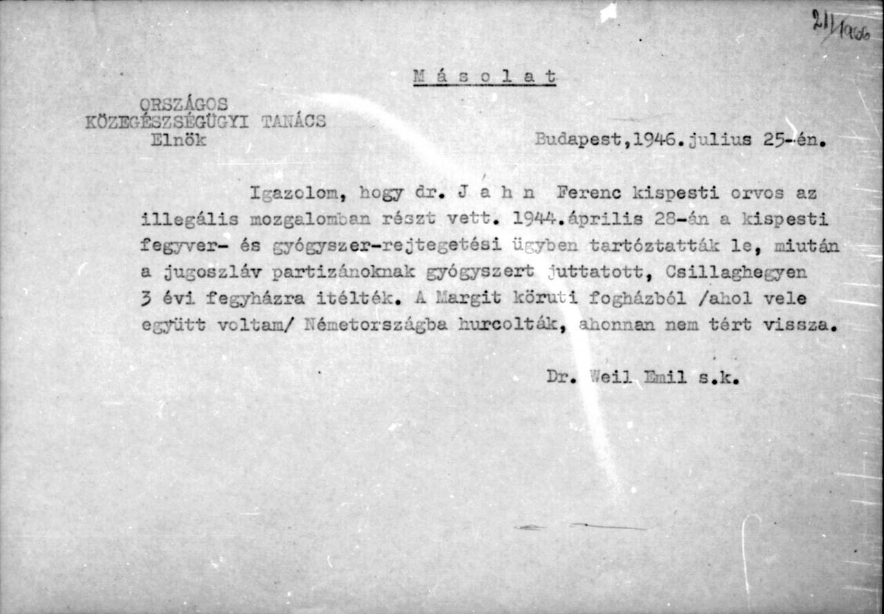 1930-ban a Richter Gyógyszergyárban voltam kerékpáros kifutó – emlékezik a kispesti Tatár Aladár. – Rengeteg gyógyszert, a legdrágábbakat is vittem Jahn elvtársnak, aki a bebörtönzötteknek, de sok más rászorulónak is szétosztotta. (Krónika emberközelből, 43. old.)